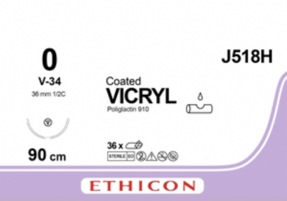 Ethicon COATED VICRYL Polyglactin 910 Braided Absorbable Surgical Suture – USP 0 – 90 cm – Violet – Single-Armed Taper Point V-34 Needle 36 mm, 1/2 Circle – J518H (Box of 36)