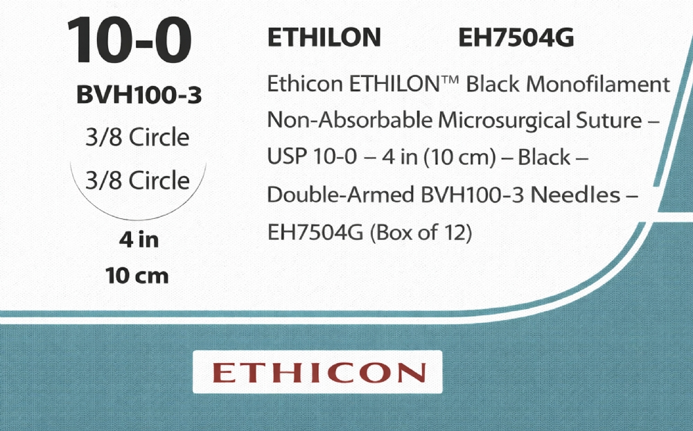 Ethicon ETHILON™ Black Monofilament Non-Absorbable Microsurgical Suture – USP 10-0 – 4 in (10 cm) – Black – Double-Armed BVH100-3 Needles – EH7504G (Box of 12)