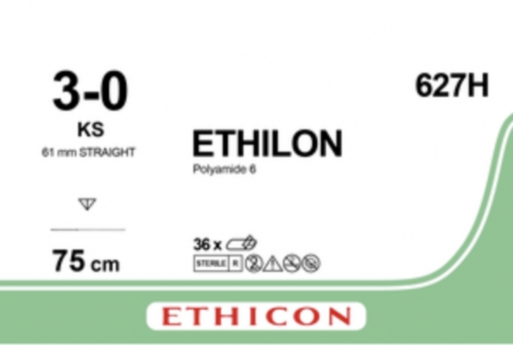 Ethicon ETHILON™ Black Monofilament Non-Absorbable Surgical Suture – USP 3-0 – 30 in (75 cm) – Black – KS Reverse Cutting Needle 19 mm – 3/8 Circle – 627H (Box of 36)