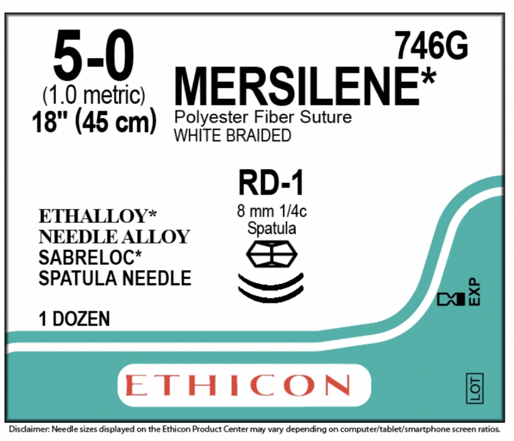 Ethicon MERSILENE® Polyester Fibre White Non-Absorbable Surgical Suture – USP 5-0 – 18 in (45 cm) – Double-Armed RD-1 Spatulated Centre Point Needles (8 mm) – 746G (Box of 12)