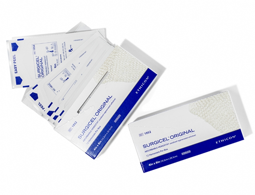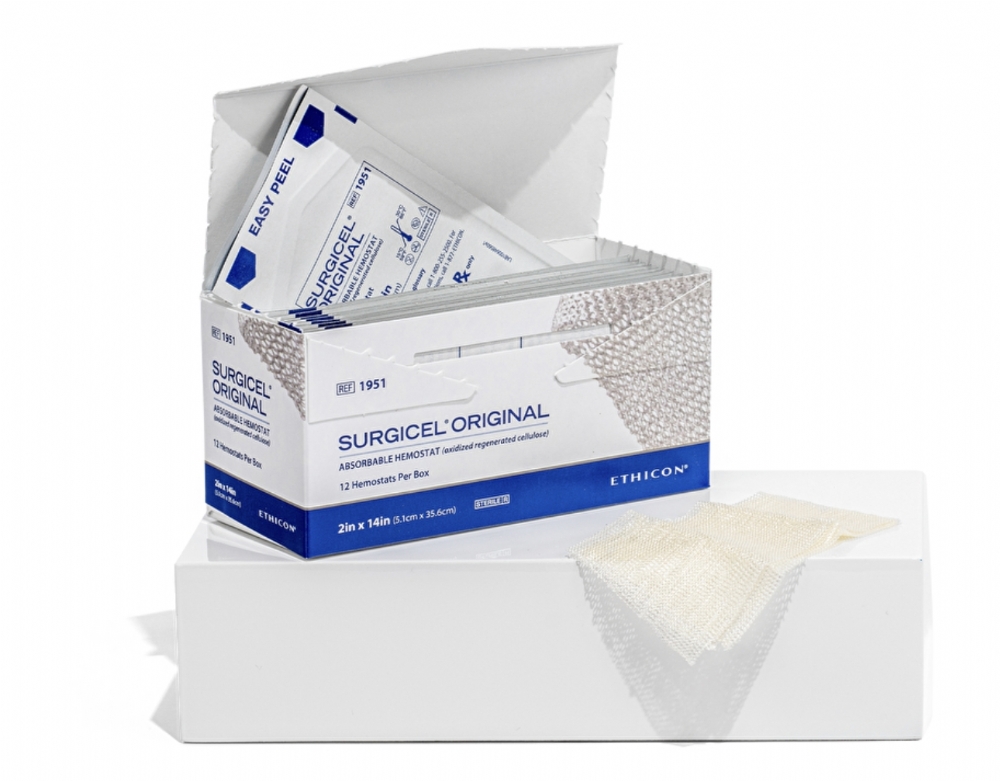 The Ethicon SURGICEL™ Original 1.25 × 5 cm Absorbable Hemostat (1906) is a sterile absorbable knitted fabric prepared by the controlled oxidation of regenerated cellulose. Designed for adjunctive haemostasis, SURGICEL™ assists in the control of capillary, venous and small arterial bleeding when conventional methods such as ligation are impractical or ineffective.
