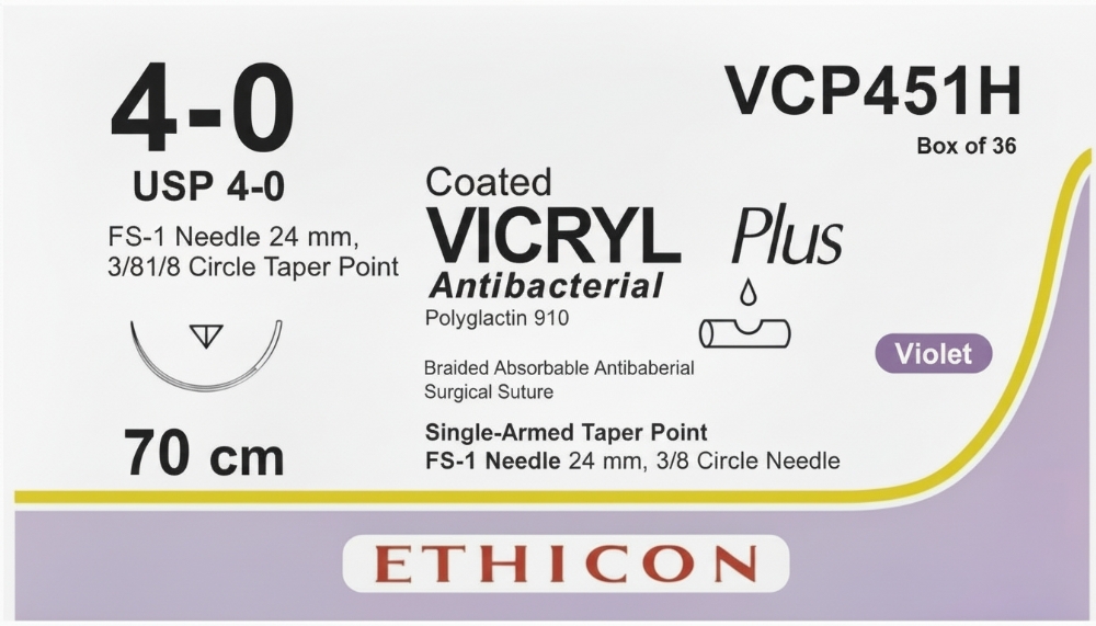 Ethicon VICRYL PLUS Polyglactin 910 Braided Absorbable Antibacterial Surgical Suture – USP 4-0 – 70 cm – Violet – Single-Armed Taper Point FS-1 Needle 24 mm, 3/8 Circle – VCP451H (Box of 36)