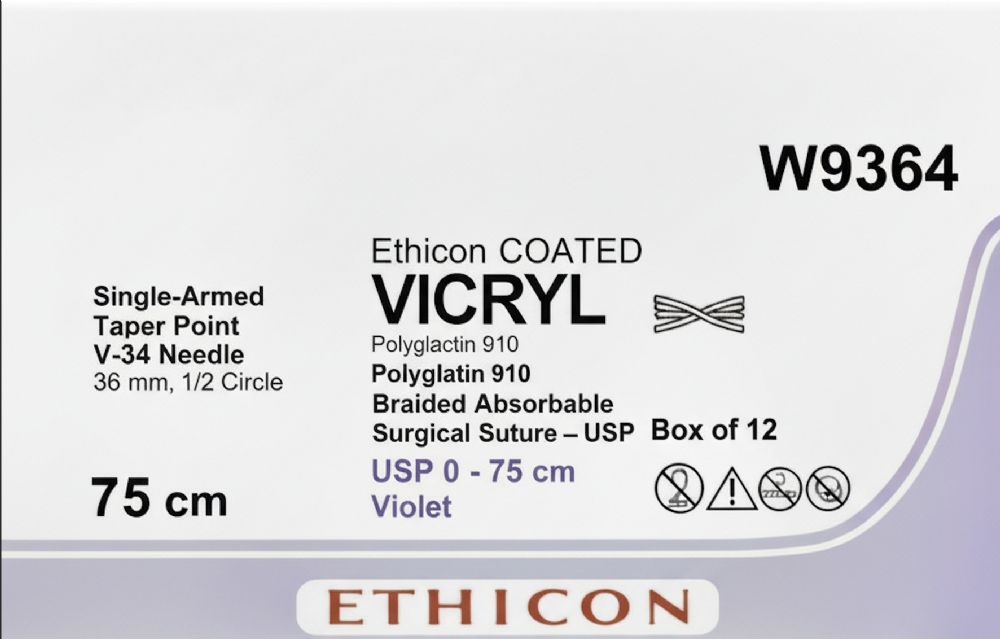 Ethicon VICRYL Polyglactin 910 Braided Absorbable Surgical Suture – USP 0 – 75 cm – Violet – Single-Armed Taper Point V-34 Needle 36 mm, 1/2 Circle – W9364 (Box of 12) Ethicon VICRYL Polyglactin 910 Braided Absorbable Surgical Suture – USP 0 – 75 cm – Violet – Single-Armed Taper Point V-34 Needle 36 mm, 1/2 Circle – W9364 (Box of 12)