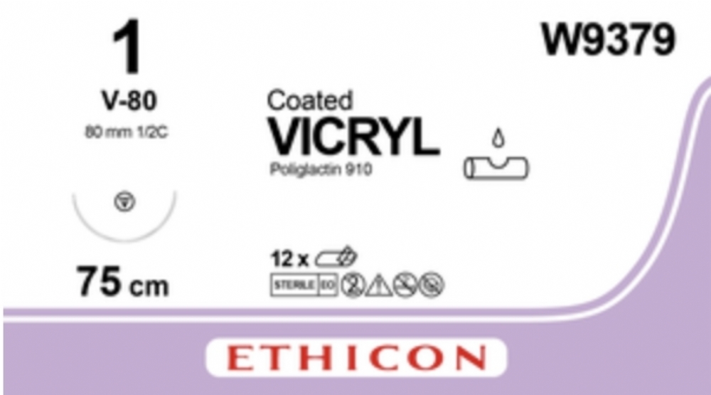 Ethicon VICRYL Polyglactin 910 Braided Absorbable Surgical Suture – USP 1 – 75 cm – Violet – Single-Armed Taper Point V-80 Needle 48 mm, 1/2 Circle – W9379 (Box of 12)