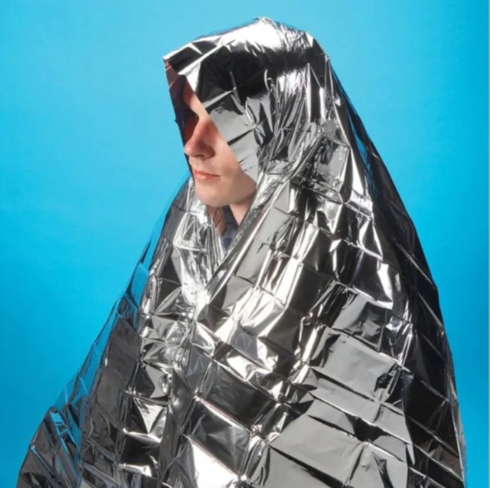 Disposable foil blanket to keep the patient warm and dry by reflecting body heat. Ideal for outdoor workers and activities such as sports events.