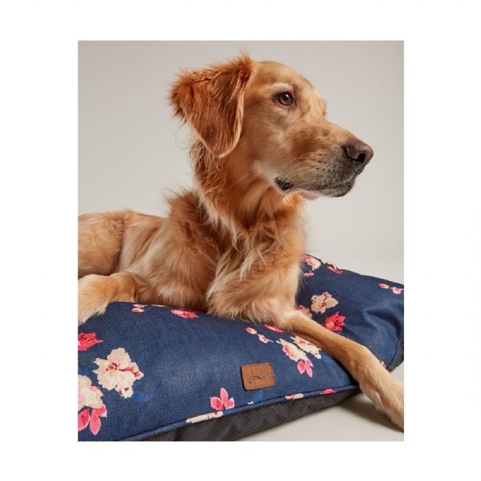 Iconic Joules floral print canvas bed with reversible navy plush cushion, Thickly padded on all sides to provide warmth and extra comfort with a Non-slip base. Machine washable at 30°C.