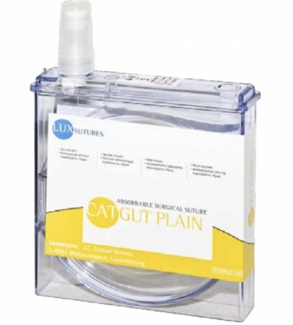 LuxSutures CATGUT PLAIN Veterinary Absorbable Sutures are natural monofilament sutures manufactured by LuxSutures from purified connective tissue (catgut), designed for veterinary surgical applications requiring short-term wound support and rapid absorption.
