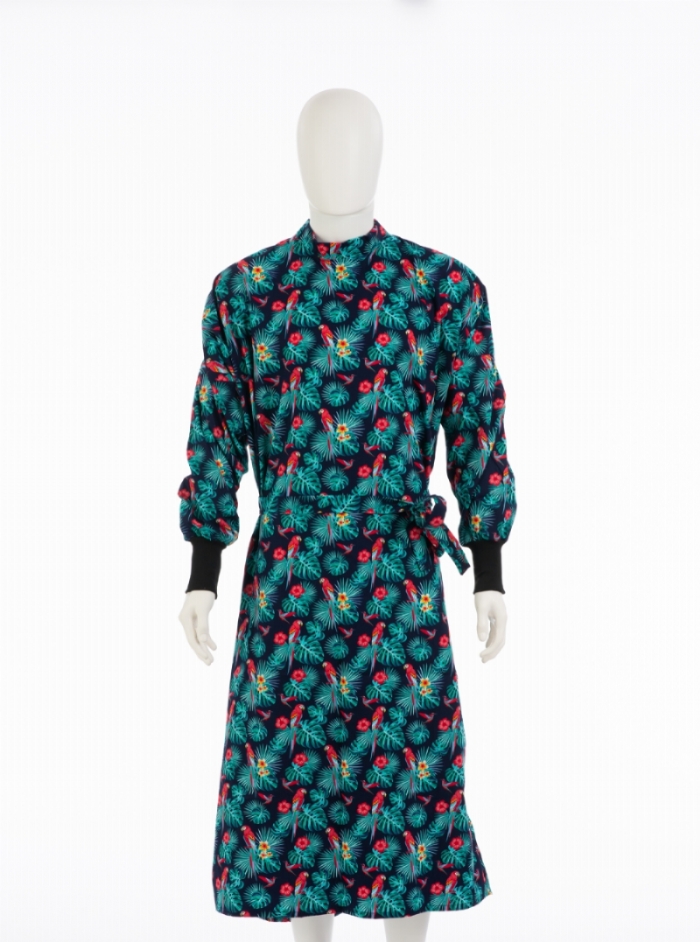 This long surgical gown is made from 100% cotton. The gown features the Rose & Parrot Navy print, a closed back and a tie belt. The surgical gown is washable and can be sterilised. The high-quality cotton gowns remain comfortable on the skin even during long operations.