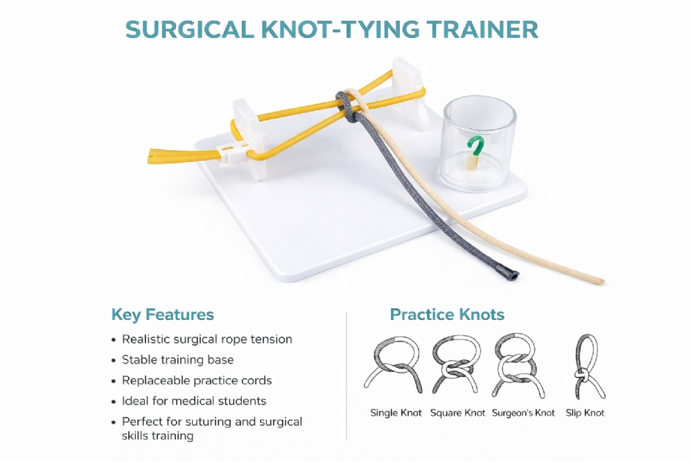 Surgical knot-tying trainers are widely used in medical schools and surgical training programmes to teach the core techniques required for safe wound closure and tissue repair.